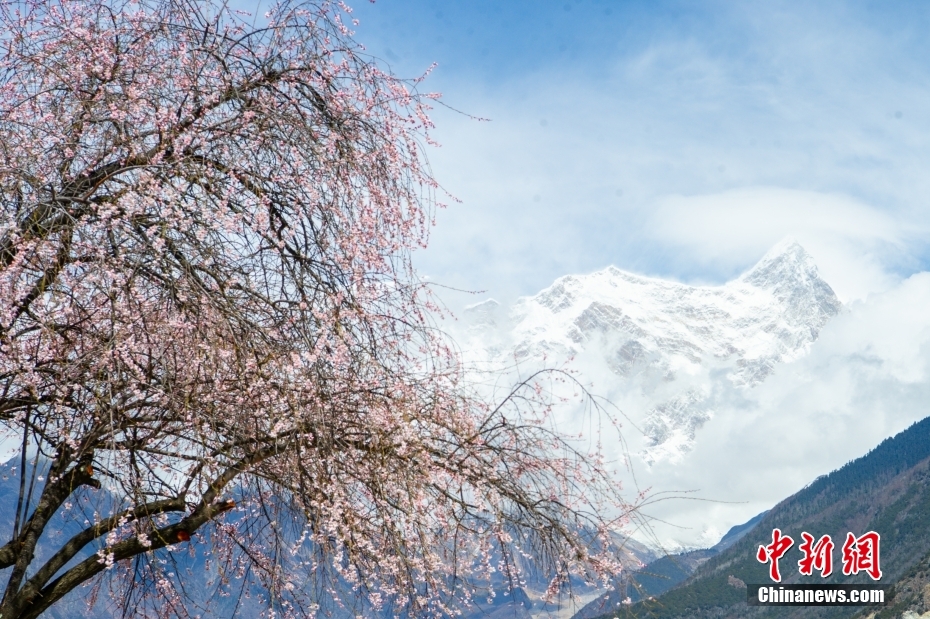 圖為桃花掩映下的南迦巴瓦峰。中新社記者 貢嘎來(lái)松 攝