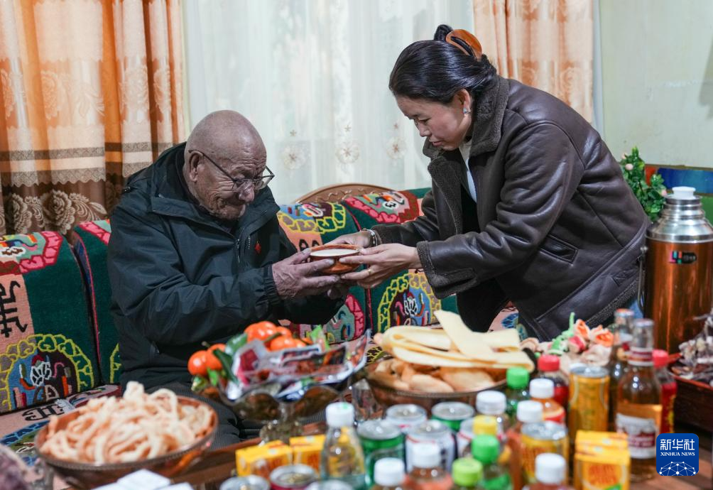 兒媳普赤給益西桑珠敬茶(3月13日攝)。新華社記者 晉美多吉 攝