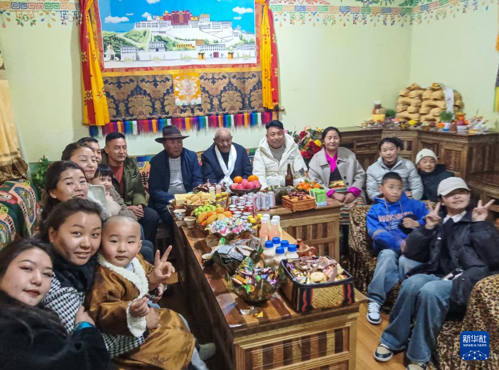 2023年藏歷新年期間,益西桑珠和部分兒孫一起合影。新華社發