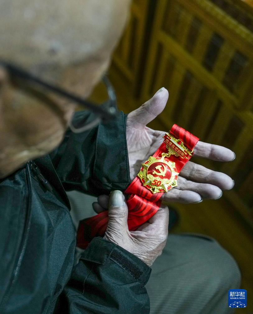 益西桑珠查看自己視為珍寶的“光榮在黨50年”紀念章(3月13日攝)。新華社記者 晉美多吉 攝