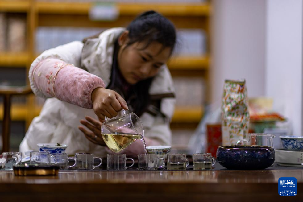 墨脫縣背崩鄉格林村村民袁美華在村里的特產銷售部給游客泡茶(4月24日攝)。新華社記者 姜帆 攝