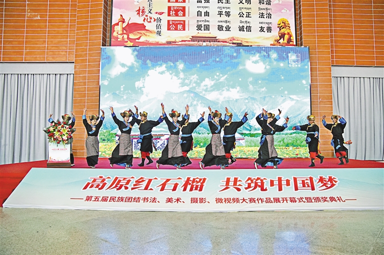 28日,“高原紅石榴 共筑中國夢”第五屆民族團結書法、美術、攝影、微視頻大賽作品展開幕式暨頒獎典禮在西藏自然科學博物館舉行。此次展覽將持續至5月8日。