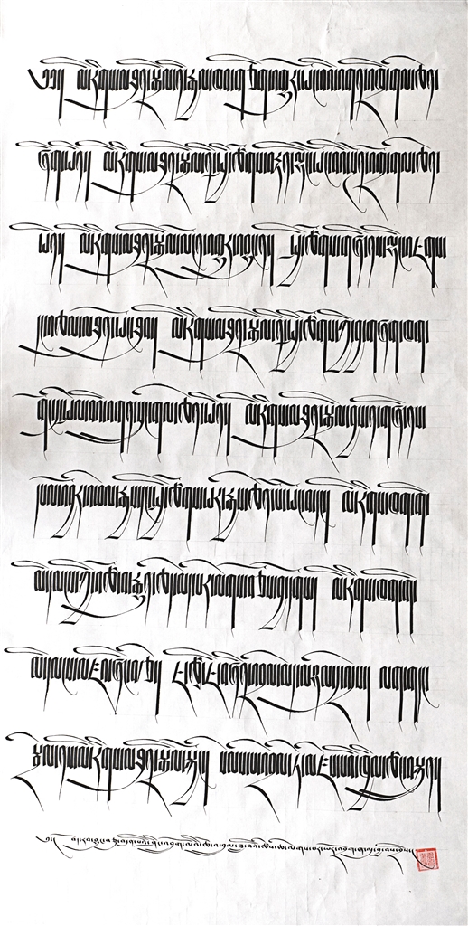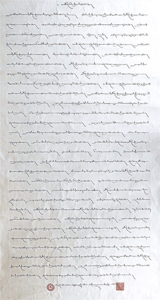 藏文書法一等獎作品《在黨的民族政策光輝照耀下各族人民繁榮發展》。作者 索朗歐珠