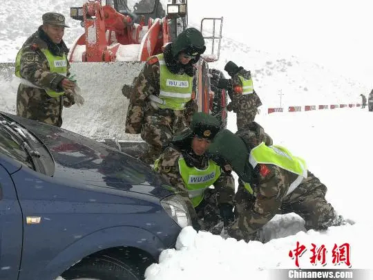 資料圖為武警官兵徒手挖雪解救被困車輛。何忠杭 攝