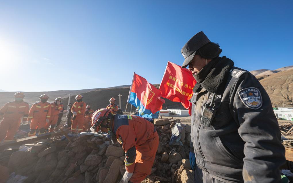 1月13日,在定日縣長所鄉古榮村,邊巴桑珠(右一)在指揮房屋廢墟清理工作。新華社記者丁增尼達 攝