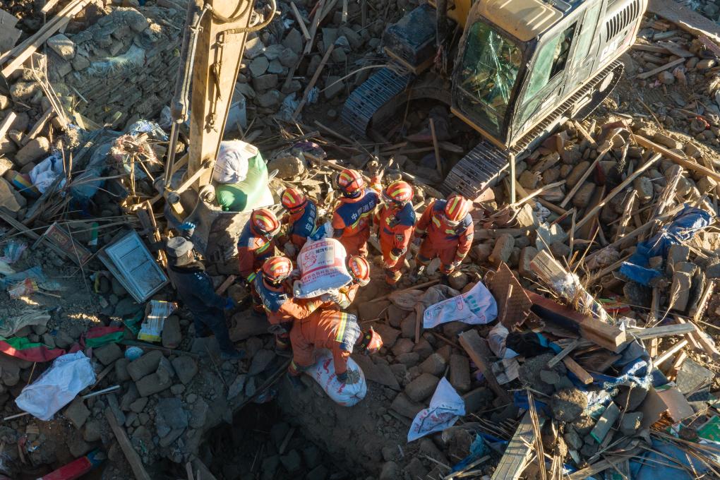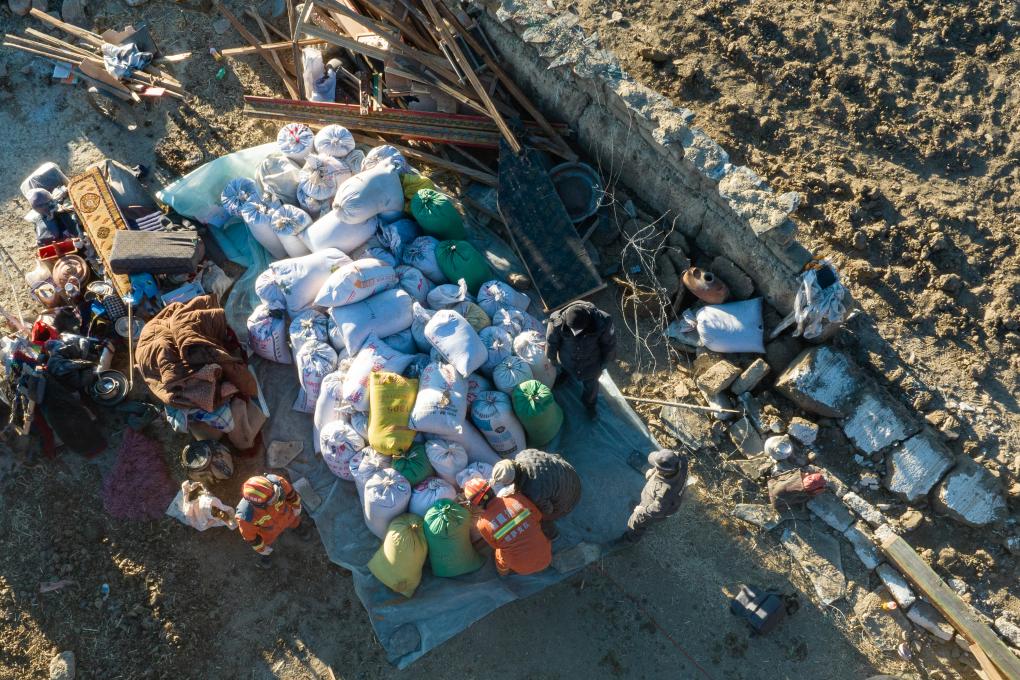 1月13日,在定日縣長所鄉古榮村,消防員們在搬運從廢墟中搶救出的青稞(無人機照片)。新華社記者丁增尼達 攝