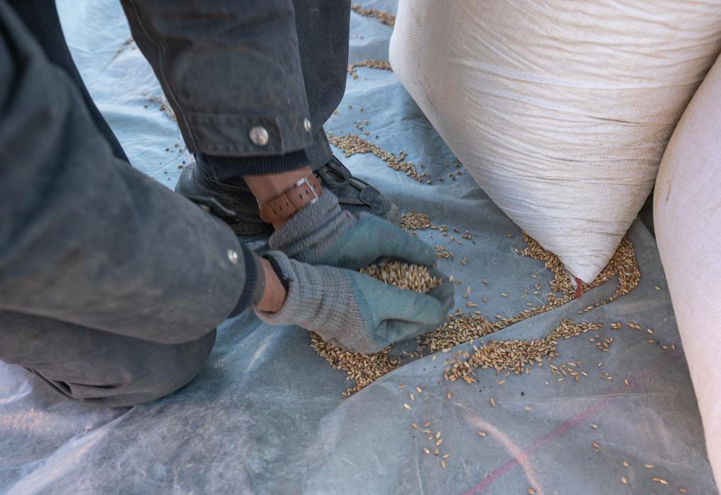 1月13日,在定日縣長所鄉古榮村,公安干警用手捧起灑在地上的青稞。新華社記者丁增尼達 攝