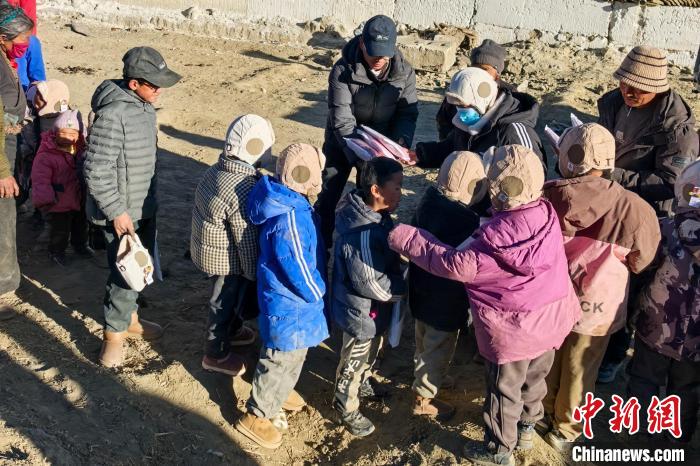 圖為1月12日,桑杰尼瑪將同事們籌款購買的保暖帽分發給村里的孩子們。受訪者 供圖
