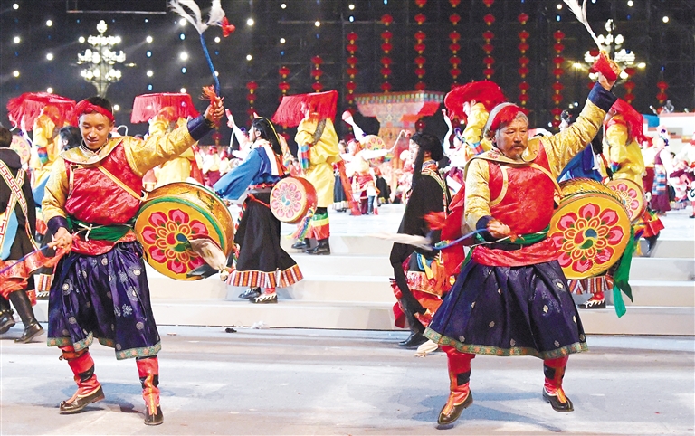 在七市(地)非遺舞蹈整合展示部分,歌舞節目《鼓潮》將熱巴鼓、背鼓、腰鼓、斯馬卓這四種西藏非遺舞蹈融合在一起,場面氣勢恢宏,給觀眾帶來震撼的視覺盛宴。