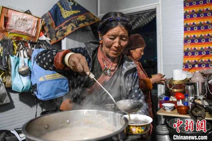 1月28日晚,西藏定日縣曲洛鄉措昂村安置板房內,當地農牧民迎來日喀則農事新年“古突夜”,這是措昂村村民曲珍在盛“古突”。 貢嘎來松 攝
