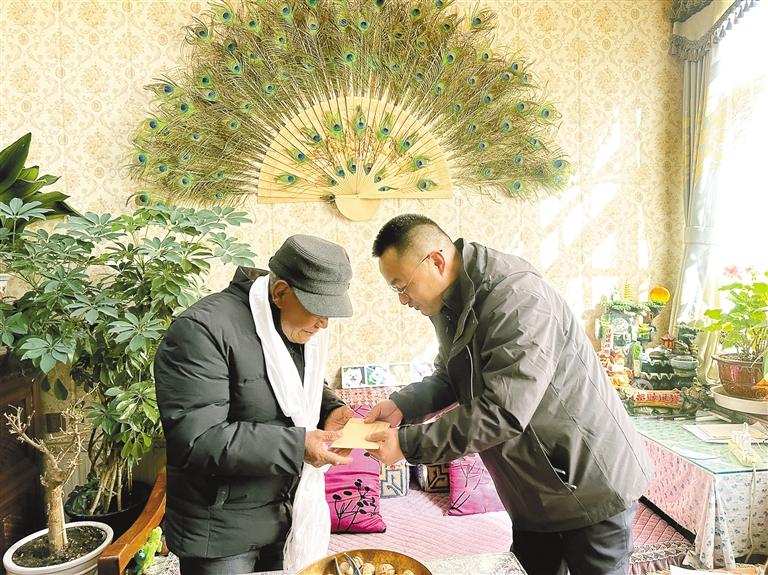 在離退休干部職工、因公犧牲遺屬家中,拉薩市人民政府辦公室相關負責人為老同志們敬獻哈達,向他們致以誠摯的問候和美好的祝福,送上節日慰問金和慰問品,并與他們親切交談,關切地詢問他們的健康狀況、居住環境及家庭情況,并聽取他們對市政府工作的意見和建議。