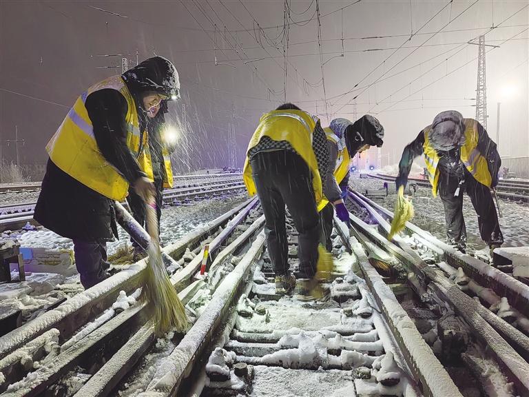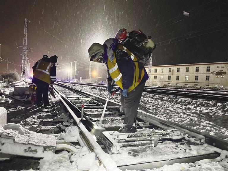 “掃雪時要注意腳下,防止滑倒……”到達拉薩西貨場1號道岔后,工長白登渠影帶領職工們按照分工,有序地使用掃把、除雪鏟、除雪鉤、吹雪機等工具,對道岔尖軌、滑床板、轉轍部位等關鍵位置的積雪進行清理。在紛紛揚揚的大雪中,大家踩雪發出的“嘎吱”聲、雪鏟除冰的敲擊聲交織在一起。