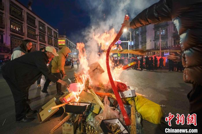 藏歷新年是西藏傳統(tǒng)民俗活動,也是中國國家級非物質(zhì)文化遺產(chǎn)。2月27日,西藏迎來一年一度的藏歷新年古突夜(類似春節(jié)的除夕),如今過古突夜,西藏民眾在點燃火把的同時,也會燃放煙花,古城拉薩煙花璀璨。圖為2月27日晚,吃完古突(一種藏式面食)后,拉薩市民在街頭燃燒火把、燃放鞭炮等,迎接藏歷新年的到來。中新社記者 江飛波 攝