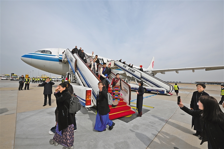 3月3日下午,出席全國兩會的西藏代表委員乘機抵達首都北京,正式開啟“兩會時間”。