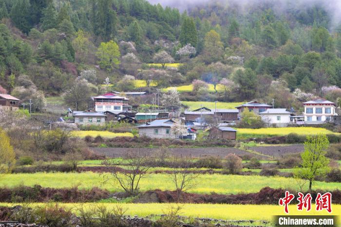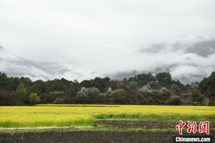 4月4日,西藏林芝市波密縣易貢鄉在雨后迎來絕美景致。云霧繚繞在群山之間,金黃的油菜花與森林、易貢湖、藏式民居、碧綠的青稞田相互映襯,宛如仙境。中新社記者 貢嘎來松 攝