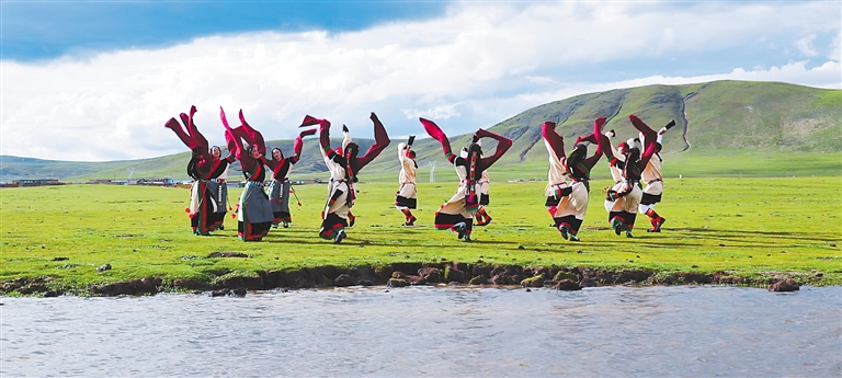 近年來,那曲文旅局以那曲傳統鍋莊舞展演為突破口,進一步推進那曲優秀傳統文化創造性轉化和創新性發展,全力打響那曲鍋莊舞品牌。 圖為那曲市群眾藝術鍋莊隊隊員在草原上跳鍋莊舞。(那曲市文旅局非遺處提供)