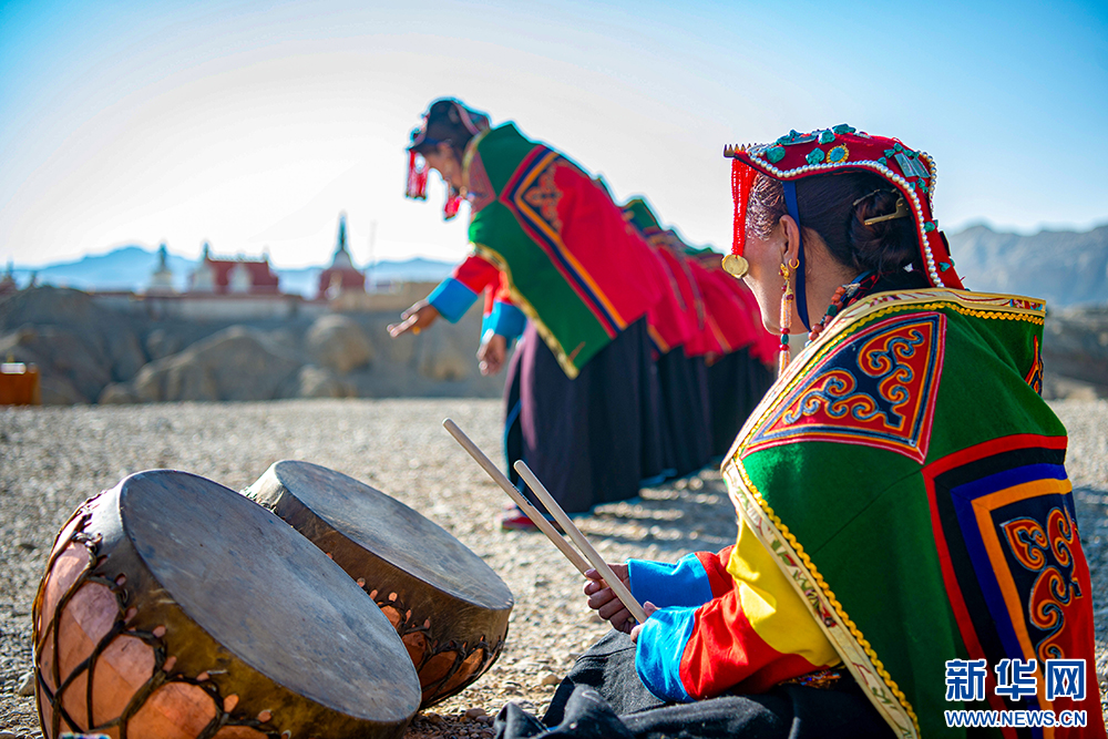 自治區級“宣舞”非遺傳承人央金(右)在古格王國遺址腳下伴奏鼓樂(6月12日攝)。新華網 旦增努布 攝