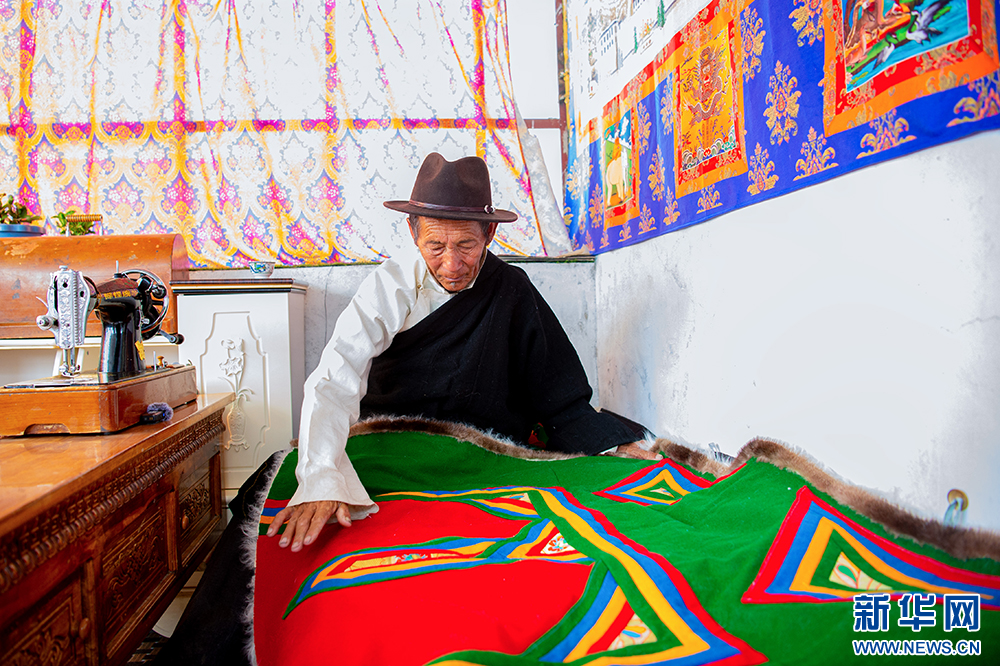 “噶爾傳統服飾”地區級代表性傳承人石達次仁在介紹自治區級非物質文化遺產“噶爾傳統服飾”(6月14日攝)。“噶爾傳統服飾”由羊羔皮和呢子內外兩面縫制而成,形狀為正方形,制作簡易,內里均為純白色的羊羔皮,羊羔皮既保暖又有裝飾性。新華網 旦增努布 攝