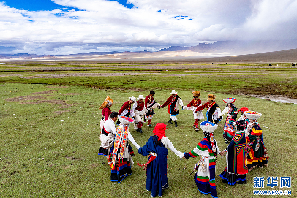 普蘭縣西德村村民在表演“果爾孜舞”(6月10日攝)。“果爾孜舞”有1300多年的歷史,傳承沿襲傳統的口口相傳。2011年,被列入國家級非物質文化遺產名錄。新華網 旦增努布 攝