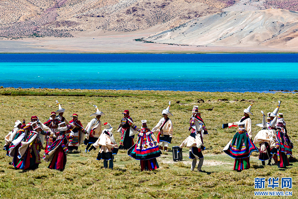 身穿自治區級非物質文化遺產“森郭服飾”的改則縣群眾在湖畔跳鍋莊(6月21日攝)。“森郭服飾”被譽為“五彩彩虹服”,主要由紅、綠、黑、黃、藍五種顏色的氆氌制成。新華網 旦增努布 攝