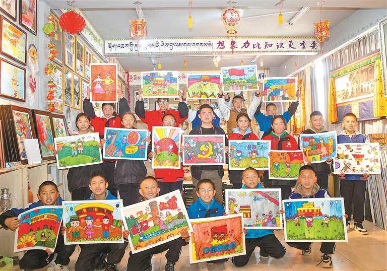 山南市桑日縣中學美術興趣社團的學生展示自己的以“鑄牢中華民族共同體意識”為主題的繪畫作品。記者 洛桑 通訊員 次仁龍布 攝