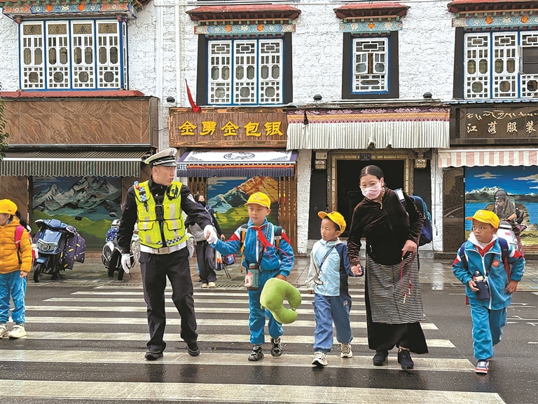 圖為拉薩市公安局交通管理支隊民警幫助獨行的學(xué)生穿過車流。記者 鹿麗娟 攝