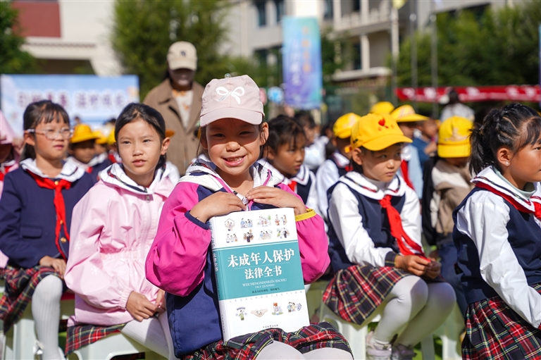 西藏自治區2025年“送法進校園”系列普法宣傳示范活動中,孩子們領到《未成年人保護法律全書》。記者 貢曲羅杰 攝