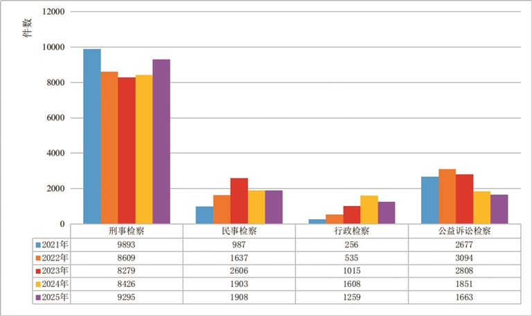 2021年—2025年全區檢察機關“四大檢察”業務趨勢變化圖