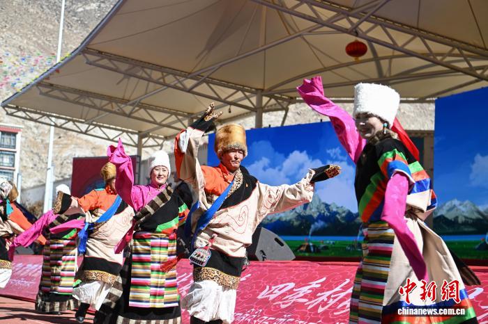 圖為羊湖民間藝術團演員表演舞蹈《嘎拉村的歡笑》。中新社記者 貢嘎來松 攝