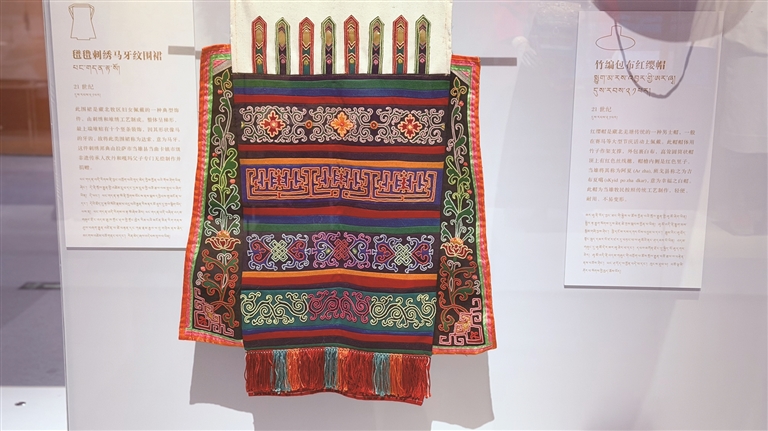 在藏北牧區,婦女們佩戴的飾件“馬牙邦典”也別具一格。這種五彩圍裙上端,堆貼著豎條裝飾,形狀酷似馬的牙齒,故而得名。在這件展品的背后,還藏著一個家族兩代人對技藝的堅守與傳承,它不僅是裝飾品,更是牧區文化與情感的象征。