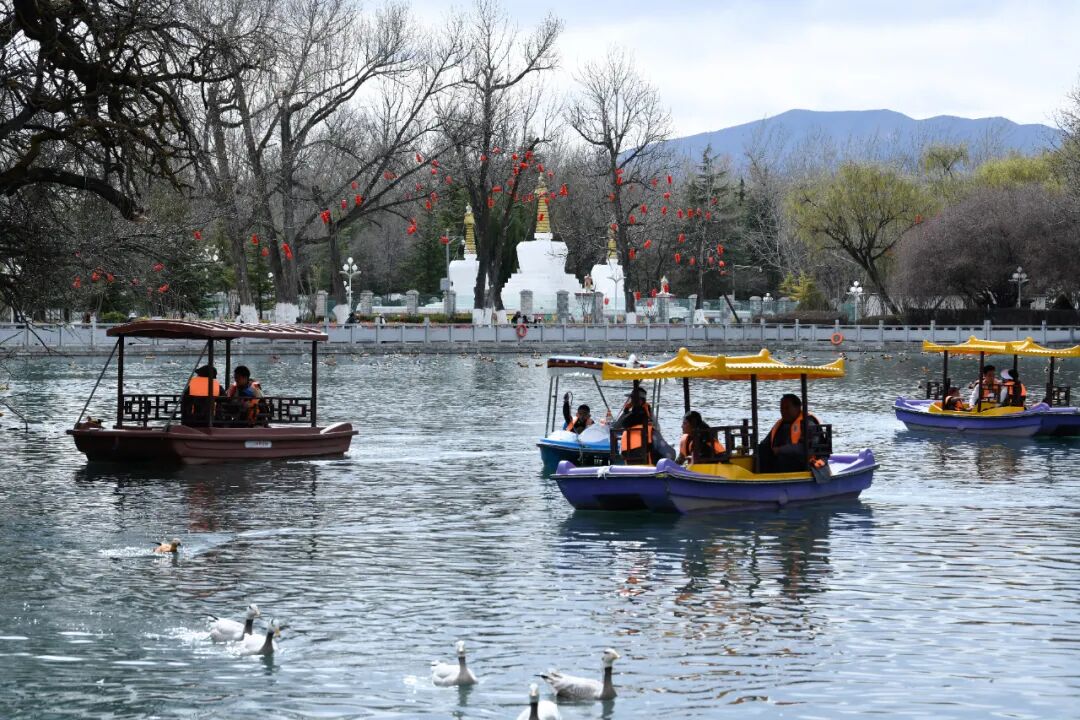 3月8日,西藏拉薩宗角祿康公園,市民乘游船賞春。古城拉薩楊柳發芽、桃花初放,春意漸濃。