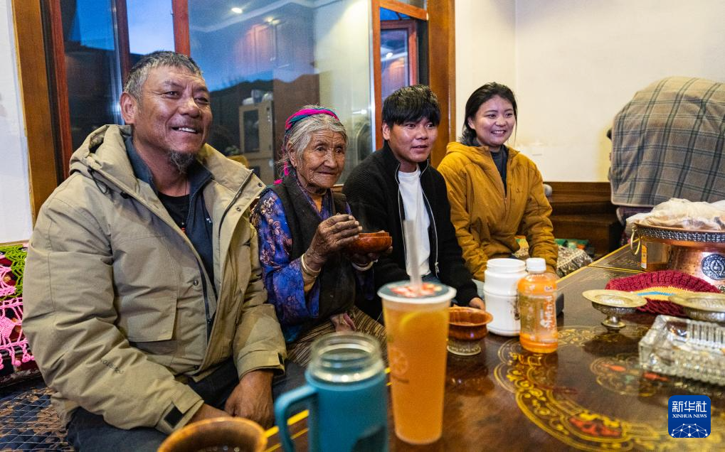 家住西藏山南市扎囊縣桑耶鎮的老人格桑美多,見證了西藏從封建農奴制到社會主義新天地的滄桑巨變。圖為格桑美多老人(左二)和家人一起看電視。新華社發