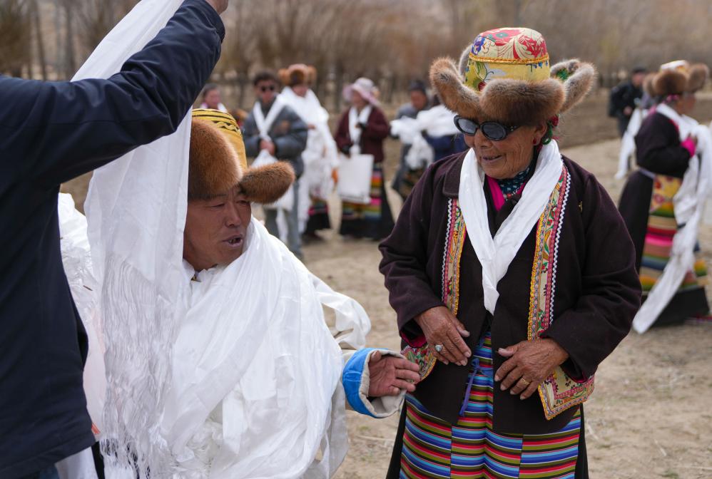 阿旺卓瑪(右)在春耕儀式上和鄉親們攀談(3月16日攝)。