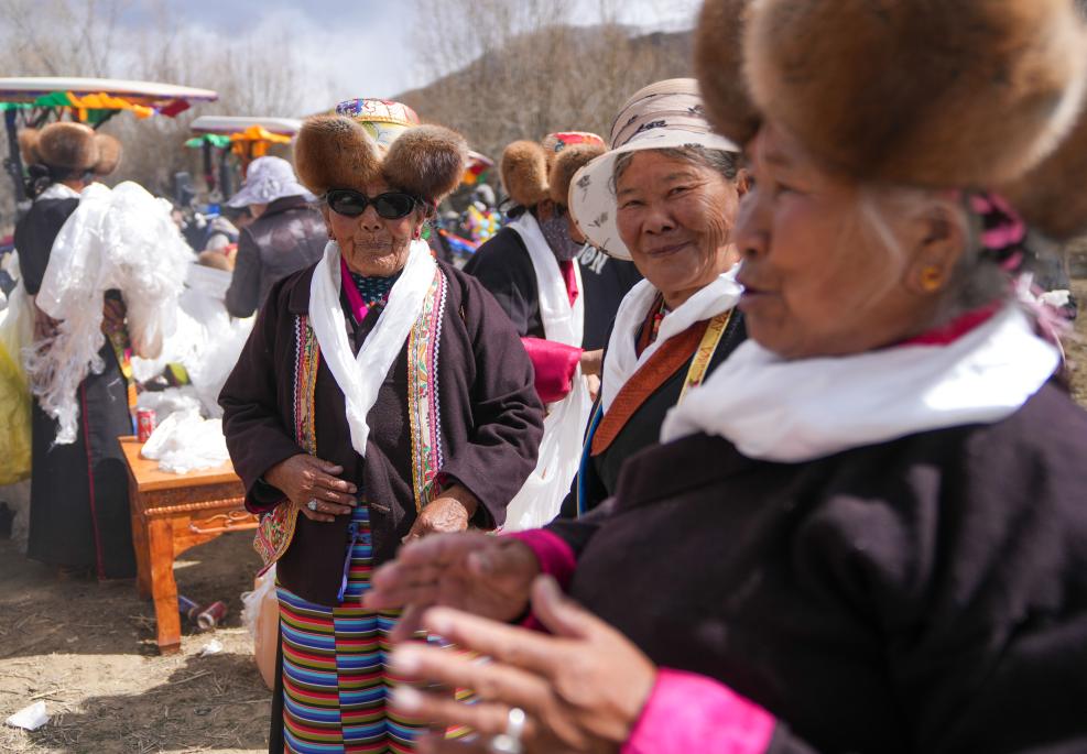 阿旺卓瑪(左)在春耕儀式上和鄉親們攀談(3月16日攝)。