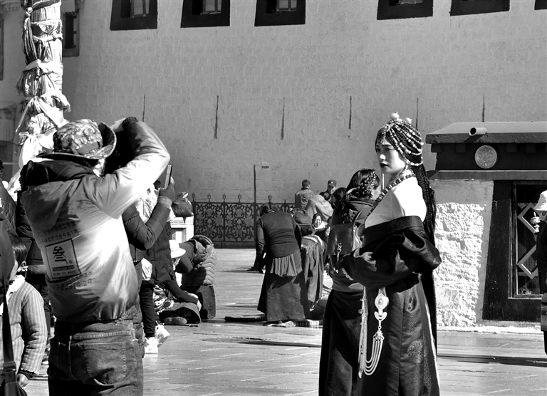 梳著彩辮,搖著轉經筒,悠游名勝古跡,細細品味西藏氛圍,然后在八廓街古老的街道和庭院里拍一組西藏特色的藏裝照。隨著“冬游西藏”的熱度提升,來西藏游玩的游客也逐漸增多,在游玩的同時專門拍上一組濃郁地方特色的寫真也成為眾多游客的選擇,許多攝影工作室因此客源不斷。 圖為12月11日,游客在拉薩老城區身著藏裝拍照。記者 梁梅 攝