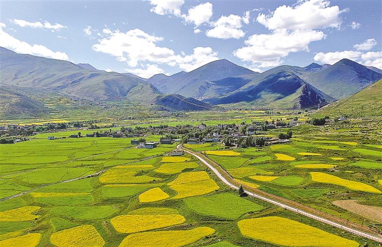 盛夏時節,驅車行駛在拉薩市墨竹工卡縣的鄉村公路上,兩側金黃的油菜花海與黝黑的柏油路相映成趣,滿載青稞的農用車與色彩鮮艷的農村客運班車擦肩而過,勾勒出一幅流動的豐收圖景。這樣的景象在如今的西藏鄉村已成為常態,一條條嶄新的公路正悄然改變著高原大地的面貌。