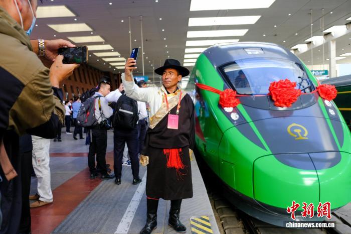 資料圖為2021年6月25日,西藏拉林鐵路開通運營,民眾在拉薩火車站與復興號拍照留念。當日,斯朗旺扎系首發司機。中新網記者 江飛波 攝