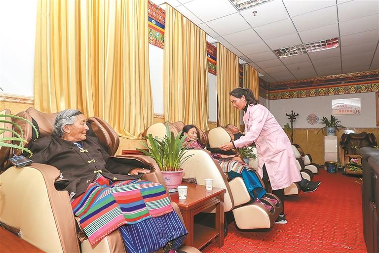 圖為阿里地區雙集中供養中心里,老人們在保健理療室進行按摩保健。記者 格桑吉美 攝(資料圖片)