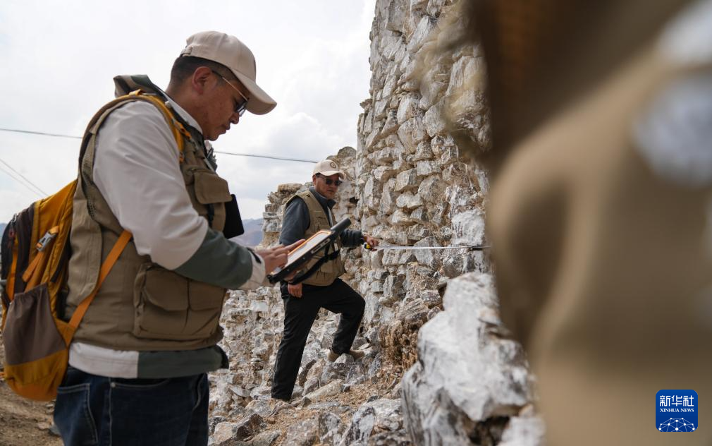 普查隊員在西藏墨竹工卡縣曲果崗塔群遺址現場開展數據采集。(2024年4月11日 攝) 新華社記者 晉美多吉 攝
