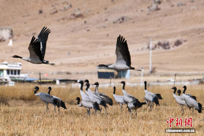 黑頸鶴是中國國家一級保護動物,是唯一生活、繁殖在高原的鶴類,被藏族民眾譽為“吉祥鳥”。近日,西藏自治區拉薩市林周縣林業和草原局介紹,作為黑頸鶴重要的越冬棲息地,今年該縣境內黑頸鶴數量在1800只至2300只之間,其中虎頭山水庫卡東村一帶占比約一半。中新網記者在周邊看到,不少黑頸鶴在田間覓食,不時飛翔于高原農田、村落上空,舞動的鶴影和聲聲鶴鳴為冬春時節的高原增添了幾分靈動。圖為2月8日,黑頸鶴群在悠閑覓食。江飛波 攝