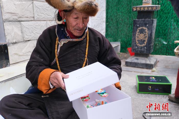 2月13日,拉薩年貨市場,來自日喀則市仁布縣的酥油花手工藝人加布正在打包剛賣出去的酥油花。中新社記者 江飛波 攝