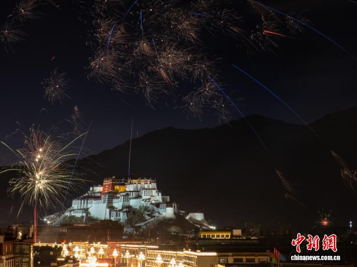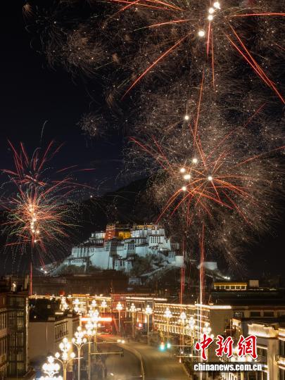 藏歷新年是西藏傳統民俗活動,也是中國國家級非物質文化遺產。2月16日是農歷除夕,在拉薩,藏族百姓也迎來了一年中最重要的節日之一——藏歷新年的“古突”夜(類似春節的除夕)。如今的“古突”夜,拉薩民眾在點燃象征驅邪祈福的火把時,也會燃放絢麗的煙花,璀璨的光華照亮了這座古城的夜空。圖為2月16日晚,高原古城拉薩煙花爛漫。中新社記者 江飛波 攝