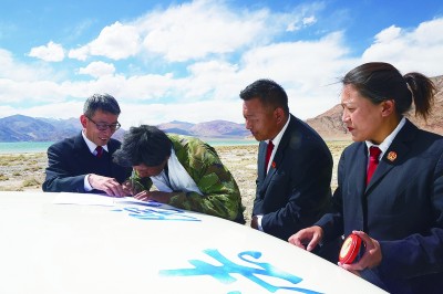在阿里地區(qū)班公湖旁,常年驅(qū)車(chē)穿行于高山荒漠辦案的基層法官們?yōu)橛龅诫y題的牧民布曲真送來(lái)了調(diào)解書(shū)。布曲真與工程公司有勞務(wù)糾紛,經(jīng)法院訴前調(diào)解終于達(dá)成協(xié)議。事情解決了,法官們也開(kāi)心地笑了。光明日?qǐng)?bào)記者 劉宇航攝