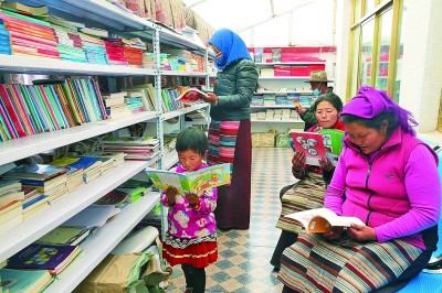 幾名農(nóng)牧民和孩子在那曲市安多縣強(qiáng)瑪鎮(zhèn)社區(qū)的牧家書(shū)屋閱讀圖書(shū)。光明日?qǐng)?bào)記者 郭俊鋒攝