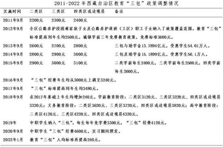 黨的十八大以來,“三包(包吃、包住、包學費)”人均標準不斷大幅提升。2012年起,西藏全面落實15年公費教育“三包”政策。同年底,西藏“三包”年總經費由2008年的3.61億元增加到12.29億元,年均增幅達36%,受惠學生增加到51萬人。 到2014年,西藏“三包”經費增加到15.19億元,全區有52.5萬名學生受益,覆蓋面100%,實現了由“選擇性保障”到“覆蓋式保障”。 中央第六次西藏工作座談會后,投入力度更大。1985-2015年30年間,西藏“三包”經費累計投入逾80億元, 而到2020年35年投入超200億元。僅2016-2020年,西藏教育“三包”資金投入達104.74億元,年均增幅11.4%。 從1985年到2020年的35年間,西藏教育“三包”政策累計調整20次,2011-2020年的10年間,就調整了10次。2022年1月,“三包”人均標準再次提高。在比如縣,2021年底全縣享受“三包”及助學金的學生達到17771人, 占比如縣總人口的24.5%。