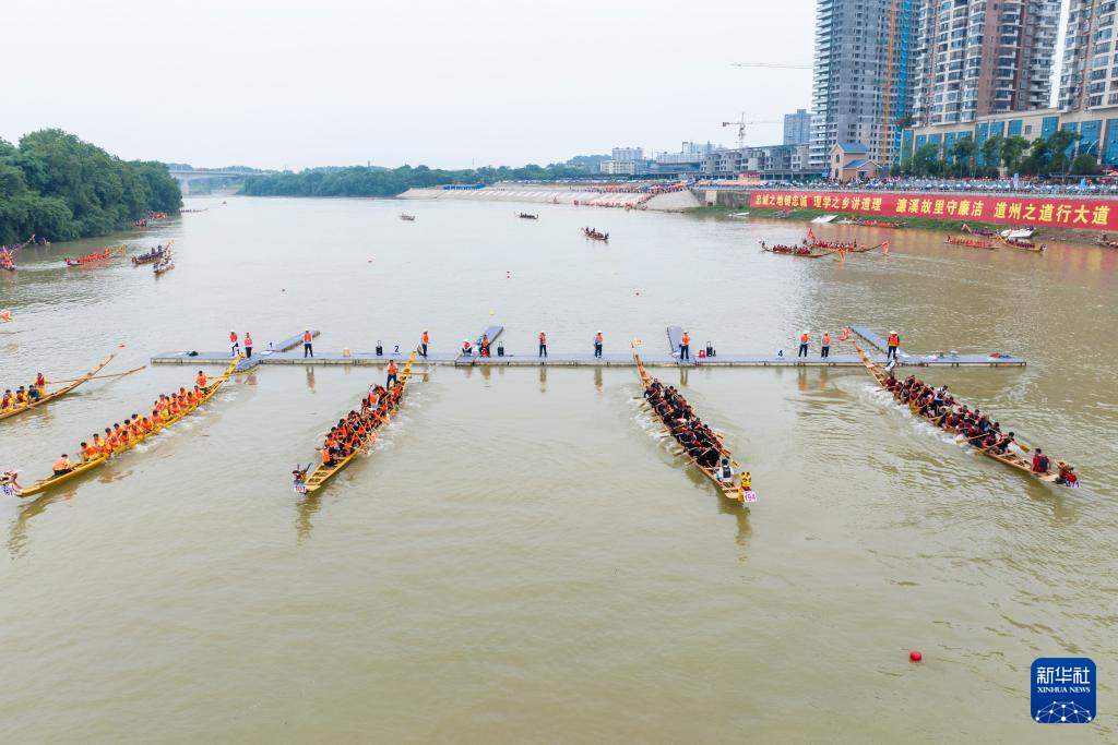 當日,“國家非遺道州龍船傳統賽”在湖南永州道縣瀟水河水域開賽,吸引了當地近200支龍舟隊5000余人同臺競技,奮楫競渡,迎接端午節的到來。
