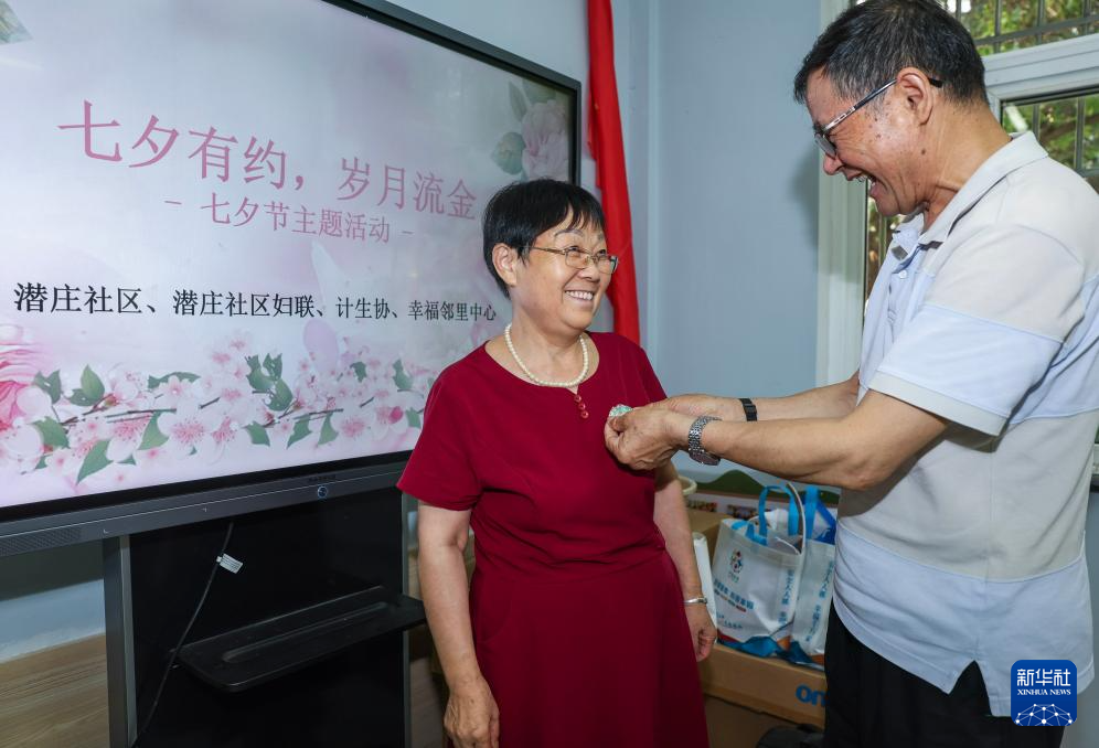 8月6日,龍泉街道潛莊社區(qū)居民湯菊生(右)把制作好的七彩螺鈿蝴蝶胸針作為七夕特色禮物送給妻子張正錫。