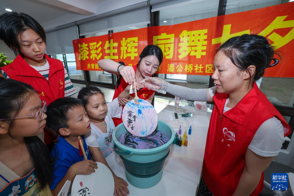 8月6日,龍泉街道潘公橋社區(qū)志愿者指導(dǎo)小朋友制作漆扇。