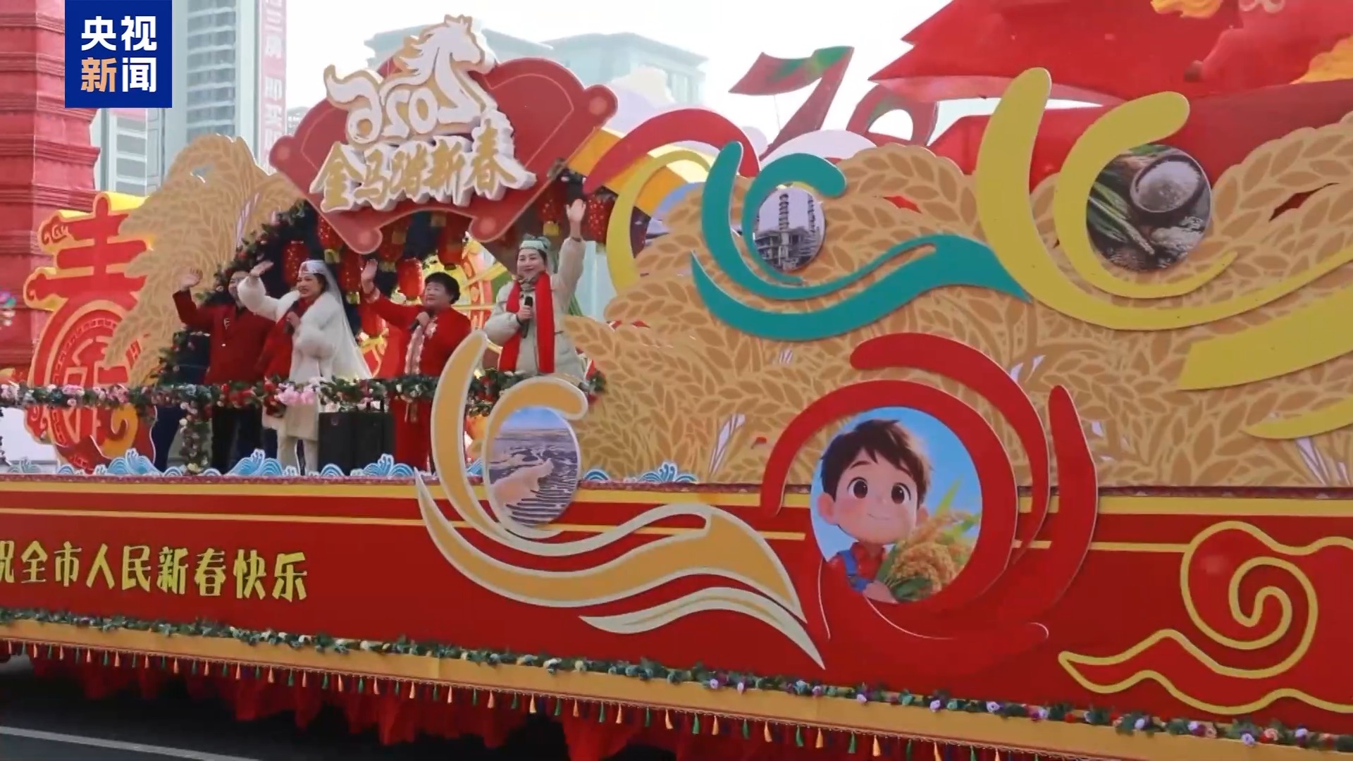 本次巡游展演采用“社火隊伍+主題花車”形式,9輛特色花車集中亮相,18支社火隊伍、近2500人參與巡游展演。敲鑼鼓、扭秧歌、舞龍舞獅等傳統項目輪番登場,吸引了眾多市民游客駐足觀看。