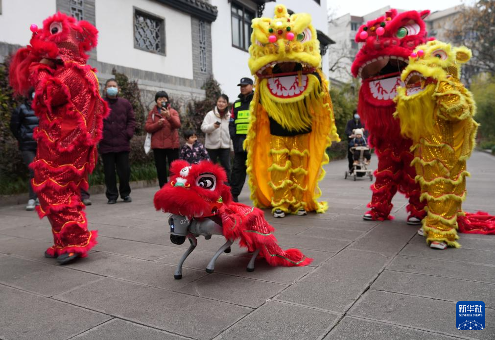 2月11日,在浙江杭州市西湖區(qū)北山街道元宵文化廟會(huì)活動(dòng)中,機(jī)器狗與演員一起為社區(qū)居民進(jìn)行舞獅表演。